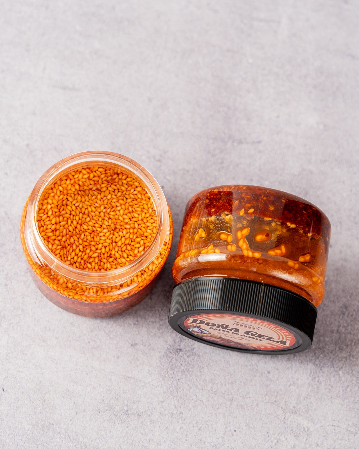 Ingredientes: Aceite de canola y/o girasol, mezcla de chiles secos, cacahuate, ajo y sal de mar.